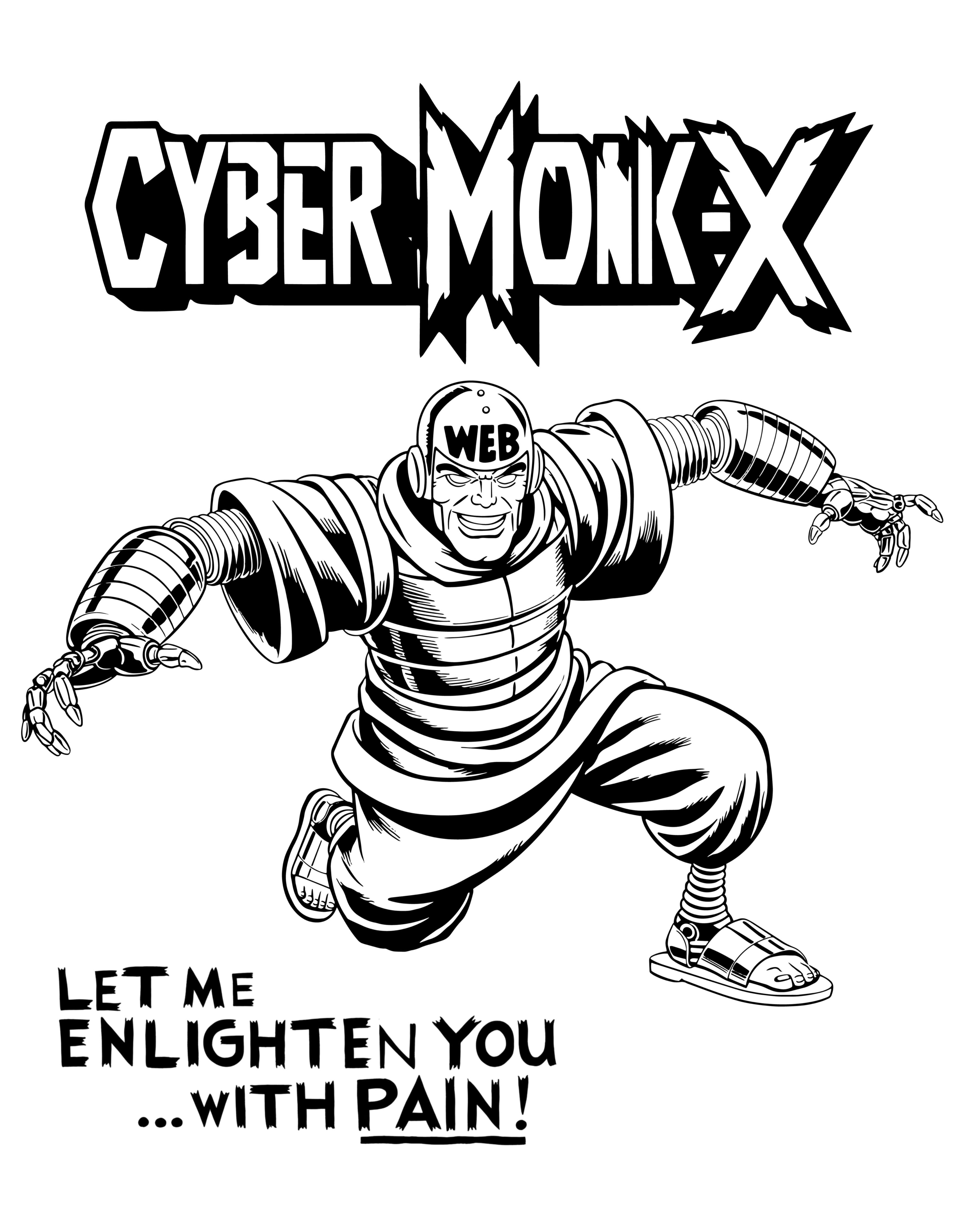 「人間の欲望」に絶望した元僧侶が、電脳の神「Web如来」に魂を売り、機械化した狂戦士 "Cyber Monk-X(サイバーモンク-X)” をデザインしたTシャツ。